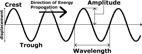 Progressive waves have several properties which can be used to describe them. The wavelength of a wave (l) is the distance between two of it's crests (measured in metres). The frequency of a wave (f) is the number of crests which pass a fixed point in the period of one second (the unit of frequency is the Hertz, abbreviation Hz). The speed of a wave (c) is a measure of the distance of a wave which passes a fixed point every second (units: ms-1). For electromagnetic radiation, c has the value 299792459.0ms-1 (±8). This is commonly known as the speed of light, but applies to all electromagnetic radiation (such as radio waves, microwaves, infrared, ultraviolet light and gamma rays). The variables c, f, l are related by the following equation.